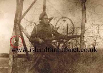 Sgt William Ronald Williams guarding the fence in 1946. Note: Red circle shows where PoWs attempted to saw through the fence post.