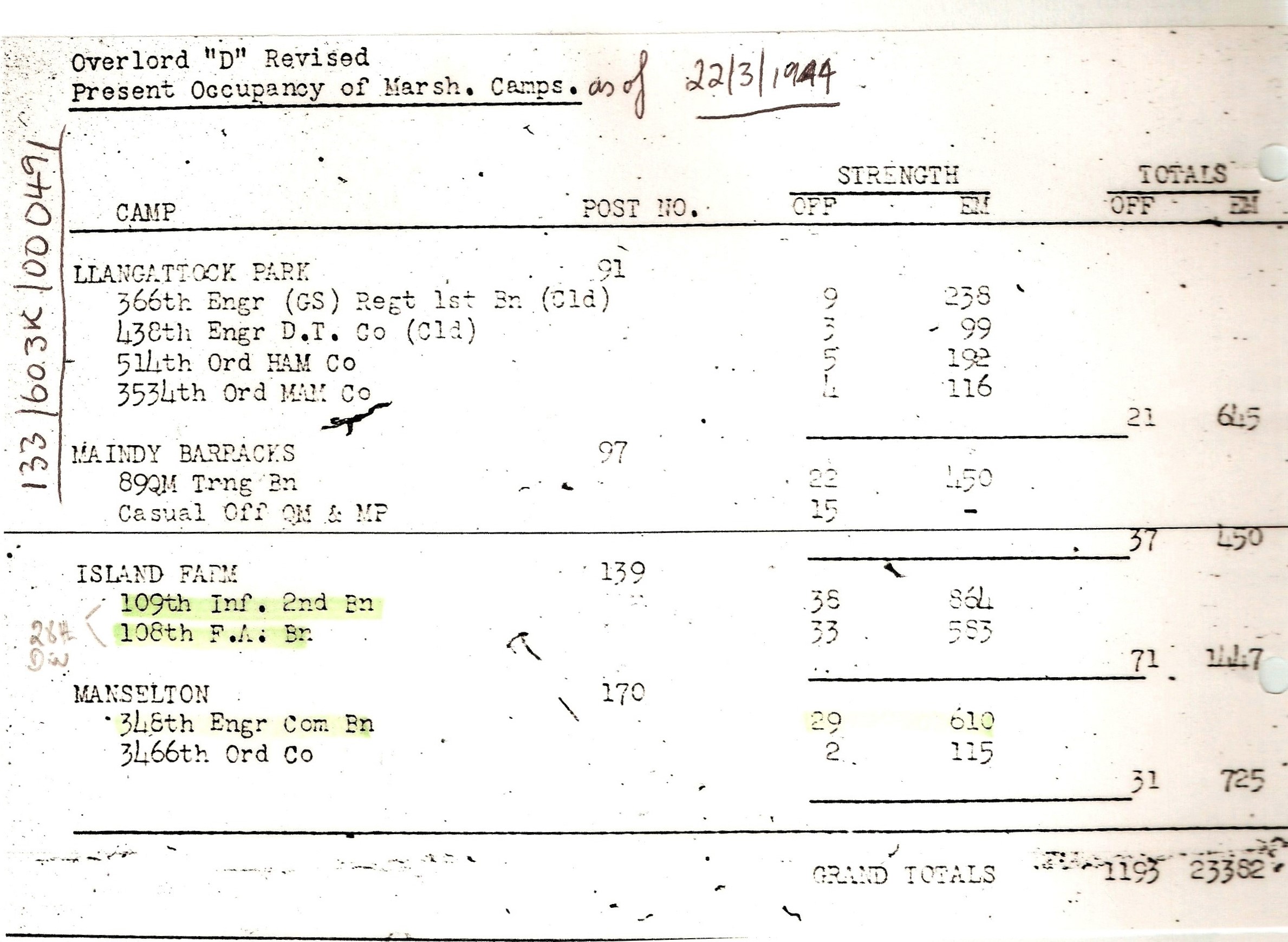 As a U.S. infantry division was a very big organisation (over 15,000 men all told), it would be billeted and dispersed over a large area while in the UK. This explains why Margam Castle was the location of the 109th Infantry Regimental Headquarters, the 1st Battalion of the 109th Infantry Regiment.