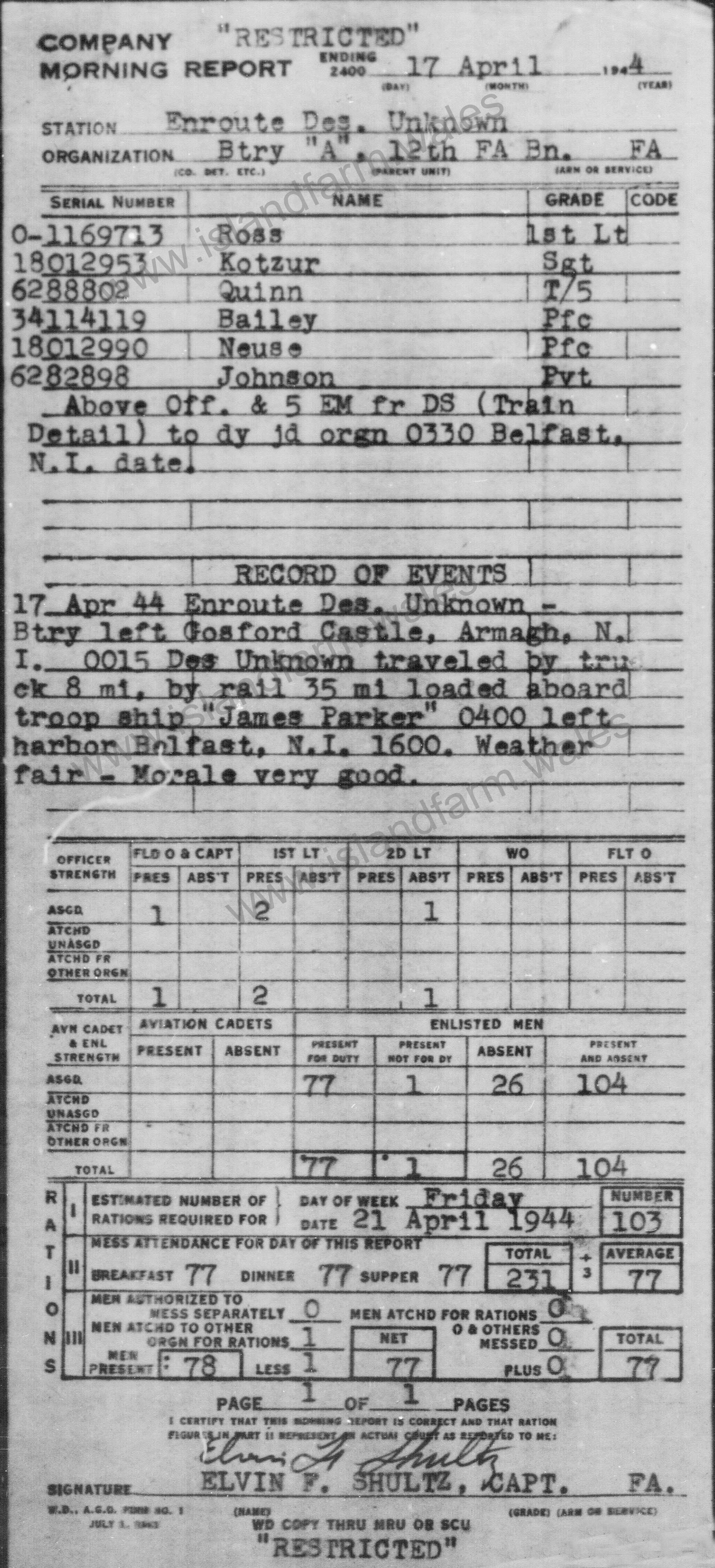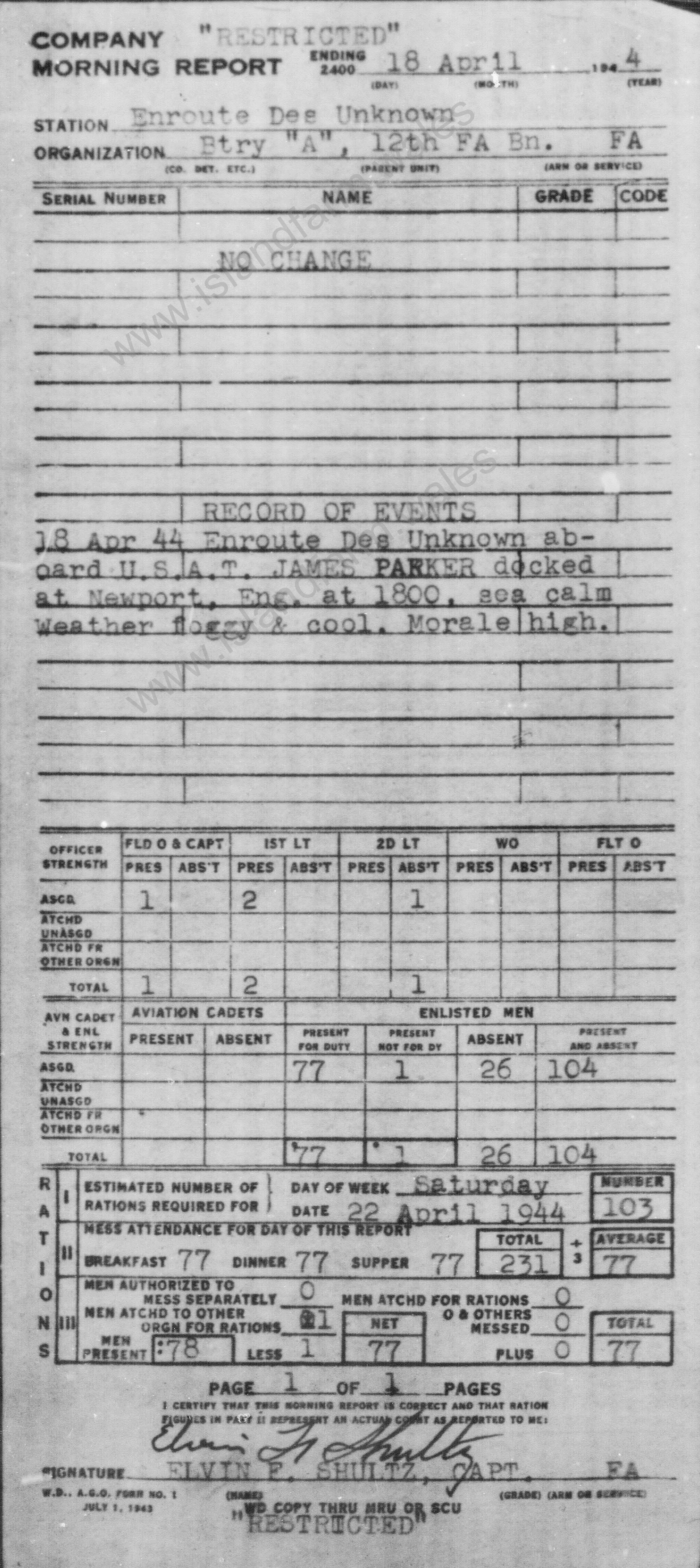 Authorized Signature: ELVIN F. SHULTZ, CAPT. FA. |