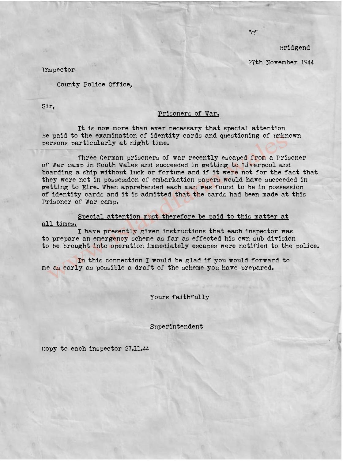 November 1944 - Superintendent Bill May issues a letter to all inspectors